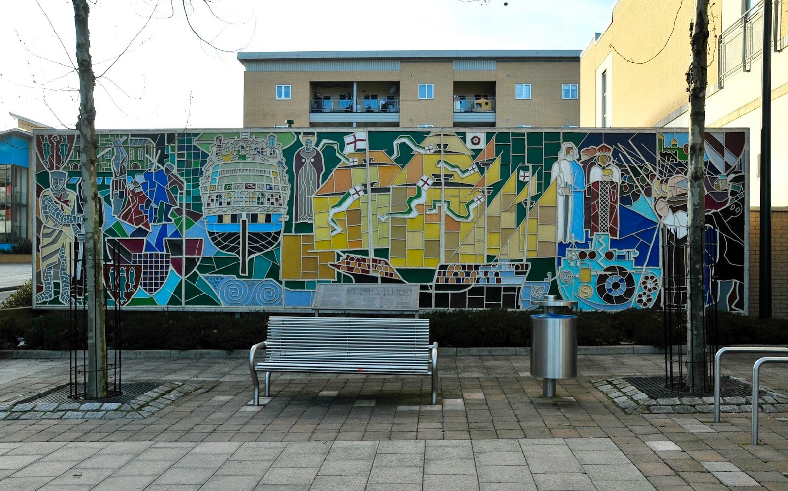 The photo above shows the Erith Mural. It is located next to the Kassiopi Cove children's soft play centre (what used to be the Blockbuster video hire store) in Erith Riverside Shopping Centre in Colebrook Street. The mural has nine panels depicting scenes inspired by the history of Erith, including the murder of Thomas A Beckett and the reign of Henry the VIII. The mural was designed and built by the artist William Mitchell between 1966 and 1970. The mural is constructed using an artistic technique called "Cloisonne" - which is similar to the production of stained glass windows. The mural was originally located on the side wall of the old Riverside Swimming Pool in Erith High Street, but was moved to its current location in the centre of the town just before the old pool site was demolished.
