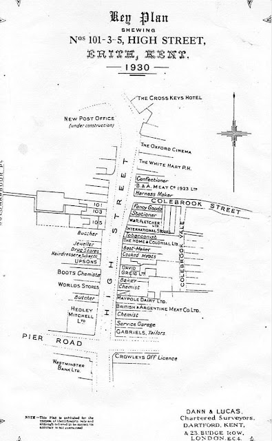 Following my publication of a map of central Erith from back in 1930 last week, regular reader and occasional contributor Bob shared his reminiscences for publication. Bob writes:- "I thought I would give you my memories of the Old Town. I didn’t work there that long but I certainly enjoyed the place. Before I worked there at the Midland Bank, Erith wasn’t the most frequented shopping place as it was two buses from Bedonwell Road, where we lived rather than a single 401 or 486 bus journey to Bexleyheath. I did go to Mitchell’s with my grandmother and was fascinated by the aerial cash system that took your money and you had wait for your change on its return. I have very fond memories of the Old Erith Town. I worked in the High Street from 1961 until 1965 and I am pleased that I never saw it’s destruction starting in 1966. My journey to work was by a 122a bus and would walk down Pier Road and then across to the High Street. I just wish I could remember every shop down Pier Road and in what order. It would be nice if there was similar map available for the 1960’s like the 1930’s one previously posted. I would always walk down the left side passing Owen’s Ironmongers viewing all their wares out on the pavement, the next store was the LEB and then a few newer shops before I would cross over at Cross Street with Blundell’s on the corner with Charles Weedon, the solicitors. Plenty of shops down on the right side. These included Barclays Bank, SEGAS, a men’s clothing shop, Gilbert’s the photographers, Erith Observer, Diploma’s Ice Cream Parlour, Mac Fisheries, V V Carriers bakers, The Market greengrocers, Woolworth’s, Randall’s stationary, Barden’s electrical, a tobacconist and the Westminster Bank on the corner. I think there was a Dewhurst’s before the multiple department shops of Hedley Mitchell’s. Mitchell’s had closed when I started in 1961. Turning right into the High Street was an empty shop in 1961 but became Llewelyn’s, a wood and DIY shop. There was an optician next door and a Fine Fare supermarket with the Panayi brother’s barbers and then Tip Top Bakeries on the corner of Queen Street. Across Queen Street were other shops including a Co-op furniture store and Selfe’s a jewellers. Crossing over the other side of the High Street with the Odeon Cinema on the corner, there was a DER TV rental shop, a launderette, a Men’s clothes shop, then a single property in 1961 of the Midland Bank. This latter became a double property in about 1964. Next door was an off licence that became a carpet shop. Back across the bottom end of Pier Road was Montague Burton with its dance studio behind. Next was Howells and Griffiths a chemist. There was a shop that just sold foam for upholstery. I think the next shop was what we would now call a delicatessen.. It was here that I would buy my freshly made lunchtime sandwiches which were slowly made and precisely wrapped in greaseproof paper. The proprietor was of European origin (German?) and of few words. I cannot remember other shops along here apart from a motor cycle/cycle shop with a red painted front and Derrett & Dormans before the White Hart Pub. Across the road was the Post Office that was my after hours job to post the daily receipts etc. Walking back was the Locomotive Inn, a house with a garden that hadn’t been converted into a shop, Alibars run by Mr Woods a friend of my future wife’s family, Stevens the butchers, Crown wallpapers, Williams grocers, Boots the Chemist. There were many other shops not mentioned and some mentioned might be in the wrong order but it was 55 years ago that to moved away to Lewisham. Two years later I was back working in the area (Atlas) but I couldn’t face seeing the changes in the town. As I said at the beginning I have many fond memories of the Old Town and had some celebrations in The Prince of Wales and the Running Horses after working hours. Summer lunchtimes I would take my sandwich to the Erith Waterfront, study the tides times from the display and watch passing ships. Happy days to be sure."